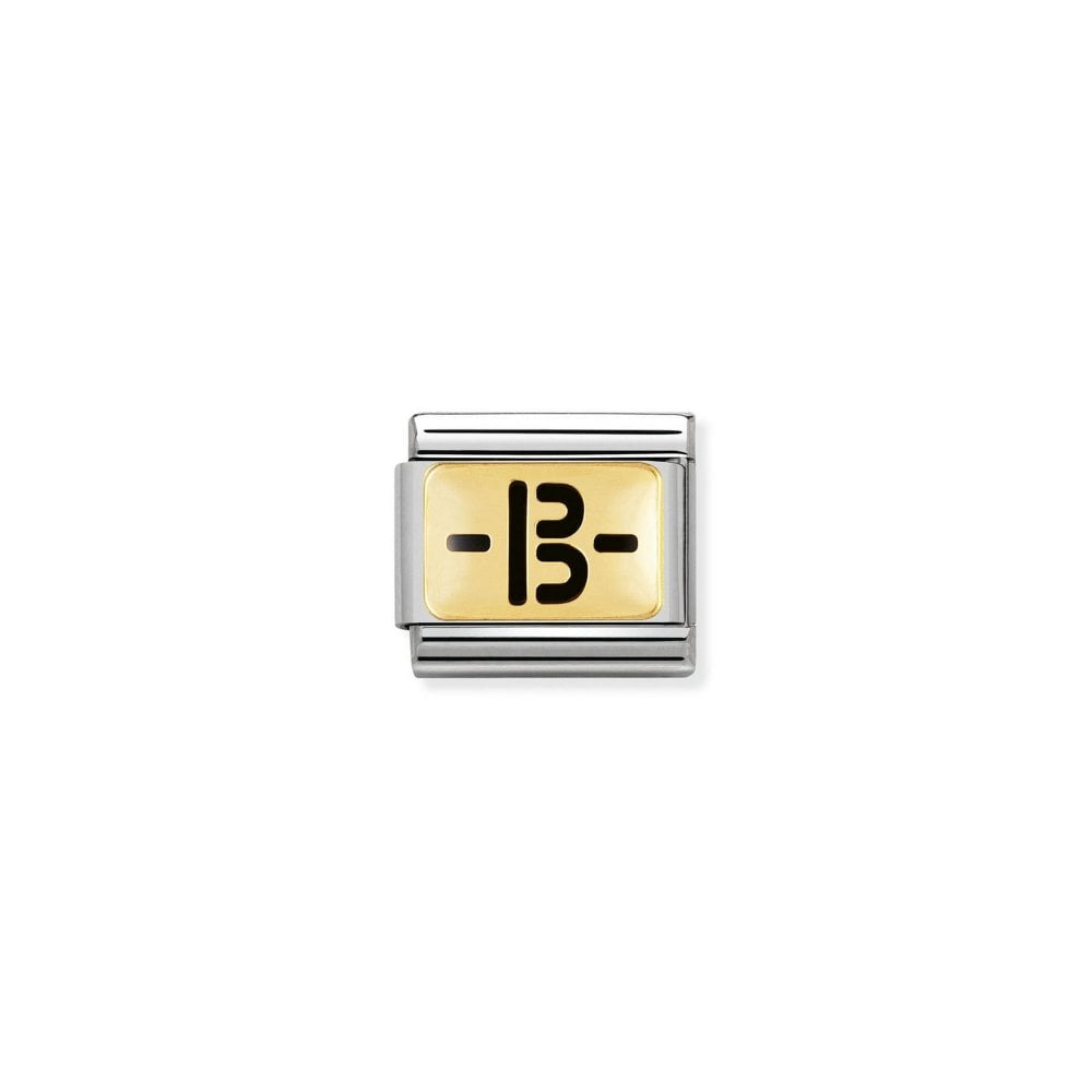 Nomination Classic Gold sarjan pala, veriryhmä B-. Kirjain on mustan värinen. Koruosa on 18 karaatin keltakultaa. Tämä pala kertoo hätätilanteessa nopeasti oman veriryhmäsi rannekkeessasi!