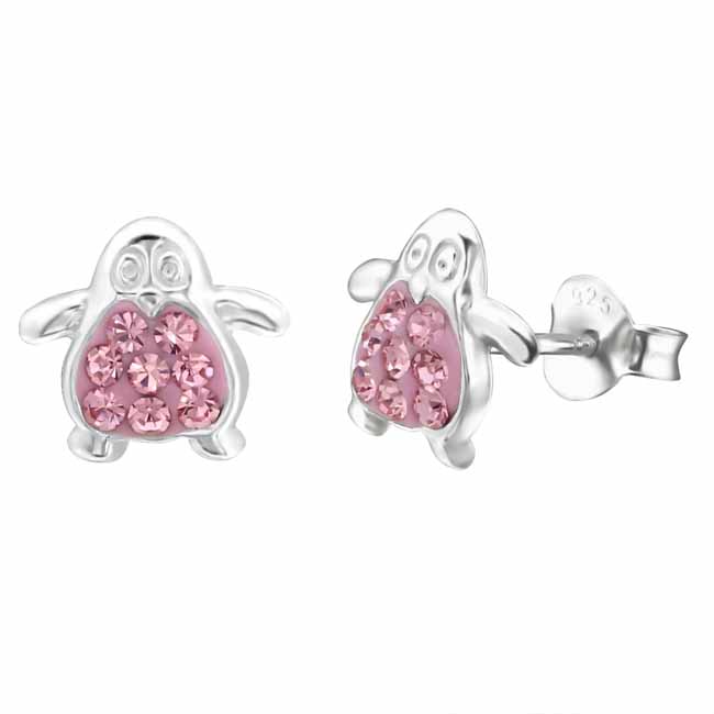Pingviini-korvakorut pinkeillä zirkoniakivillä. Näissä pingu-korviksissa on luotettava tappikiinnitys. Korvakorujen koko on 10 x 9 mm. Sirot ja kevyehköt nappikorvakorut. Korvakorujen valmistusmateriaali on laadukas nikkelitön 925 sterling hopea.