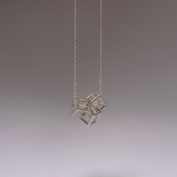 Naisten hopeariipus kauniilla ja vangitsevalla geometrisellä muodolla, jossa kolme kuutiota ovat kiinni toisissaan, mutta kuitenkin vapaita liikkumaan. Kuutiollinen-korusarja on saanut inspiraationsa timantin kuutiollisesta kiderakenteesta, ja sen lähtöajatuksena on ollut timantin matka maan uumenista valmiiseen koruun. Tässä korussa timantti on mukana vain ajatuksena. Kuutiollinen kaulakoru on rento ja huoleton koru, joka sopii hyvin jokapäiväiseen arkikäyttöön.
