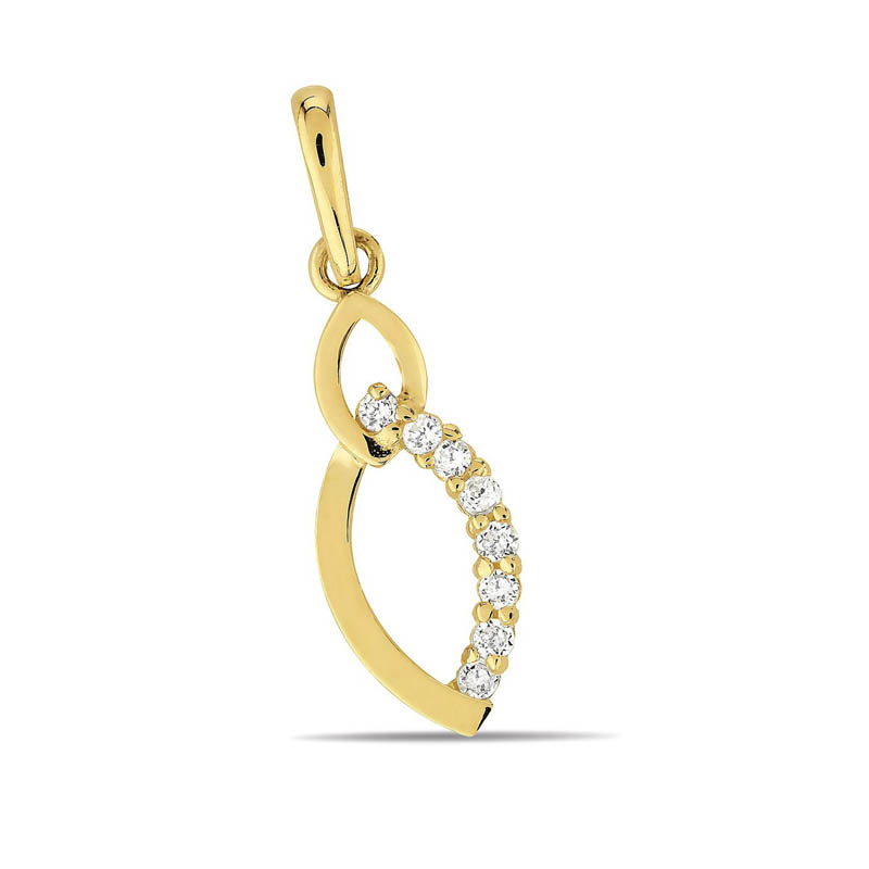 Elegantti ja siro naisten kultariipus. Tämän keltakultaisen riipuksen koruosaa koristaa kauniit zirkoniakivet. Riipuksen pituus ilman riipuslenkkiä on 15 mm ja leveys 6 mm.
