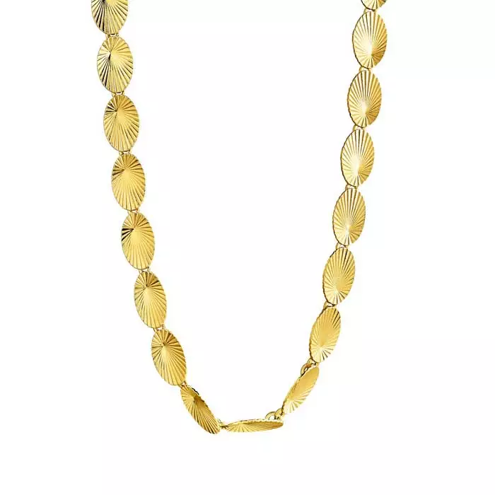 Tämä Ritva-Liisa Pohjalaisen Sisin-sarjan näyttävä kaulakoru asettuu upeasti kaulalle. Se koostuu sarjalle tyypillisistä soikeista osista, jotka muodostavat näyttävän, yhtenäisen rakenteen. Kaulakoru on valmistettu laadukkaasta keltakullatusta 925 sterling-hopeasta. Kaulakorun pituus on 50 cm ja leveys noin 11 mm.