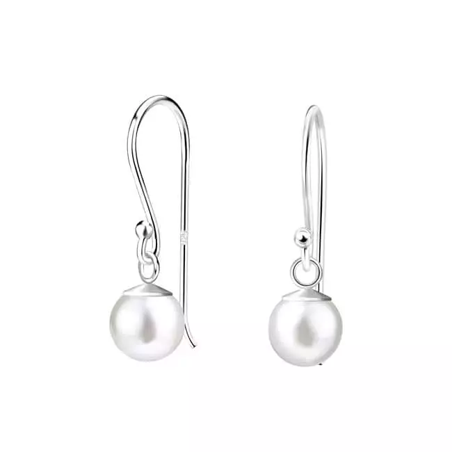Hopeiset roikkuvat helmi-korvakorut. Synteettisen helmen koko on 6 mm. Korvakorujen valmistusmateriaali on laadukas nikkelitön 925 sterling hopea.