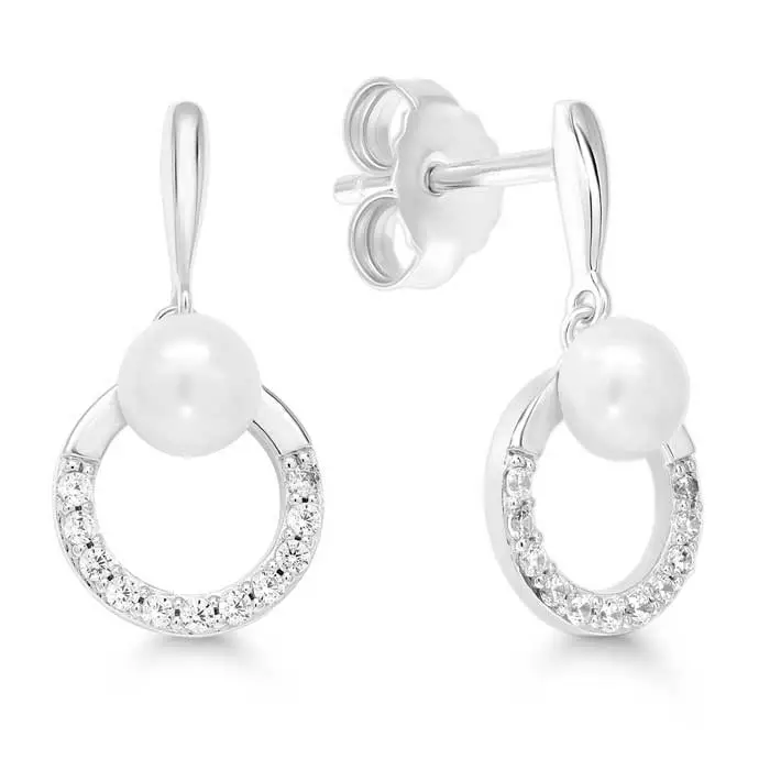 Hopeakorvakorut kirkkailla zirkonia-korukivillä ja valkoisilla makeanveden helmillä. Näiden roikkuvien tappikorvakorujen koko on 10 x 19,4 mm. Korvakorut on valmistettu laadukkaasta 925 hopeasta ja niissä on tukeva tappikiinnitys.