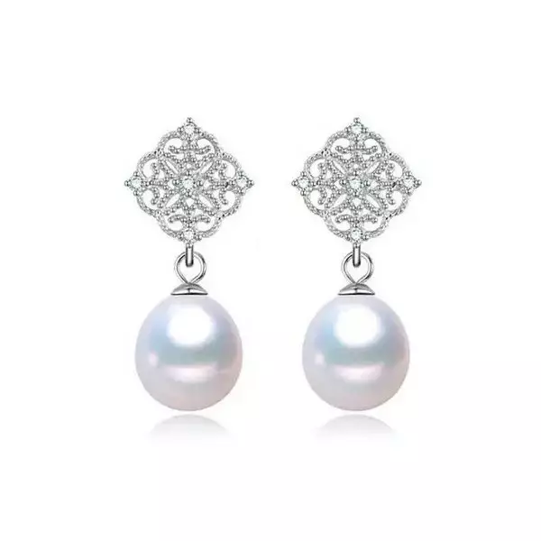 Hopeiset roikkuvat korvakorut helmillä ja zirkoneilla Koristeelliset hopeiset korvakorut aidoilla makeanveden viljelyillä helmillä. Vaaleiden makeanveden helmien koko on noin 8 mm. Zirkoneilla... Lue lisää