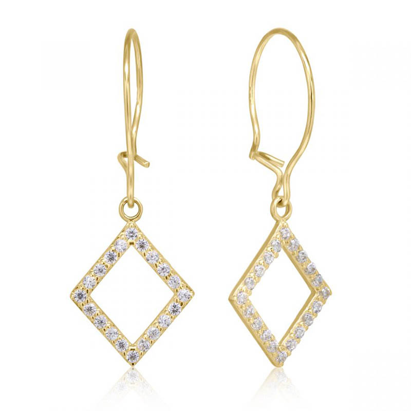 Kauniit ja elegantit roikkuvat kultakorvakorut, materiaalina 14 karaatin keltakulta. Upeat vinoneliön muotoiset korvakorut säihkyvillä zirkoneilla. Koukkukiinnitys lukolla.