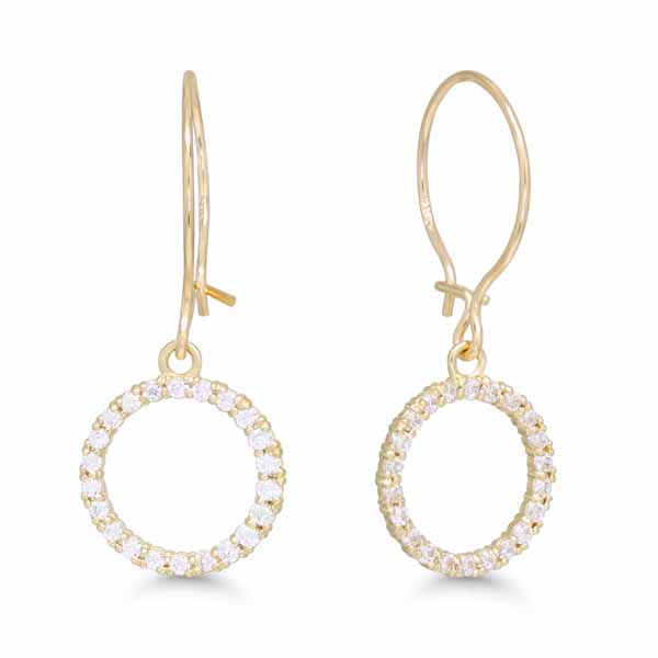 Naisten 14 karaatin keltakultaiset roikkuvat korvakorut. Näitä ympyrän muotoisia koukkukorvakoruja koristavat säkenöivät zirkonia-korukivet. Korvakoruissa on lukollinen koukkukiinnitys. Korvakorujen kokonaiskorkeus on 23 mm, ja koruosan koko 9,5 mm.
