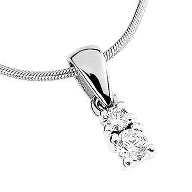 Pelkistetyn ihastuttava timanttiriipus kahdella timantilla, yhteispainoltaan 0,16 ct. Materiaali 18K palladiumvalkokulta. Sopii niin piristämään arkea kuin säihkymään juhlissa!