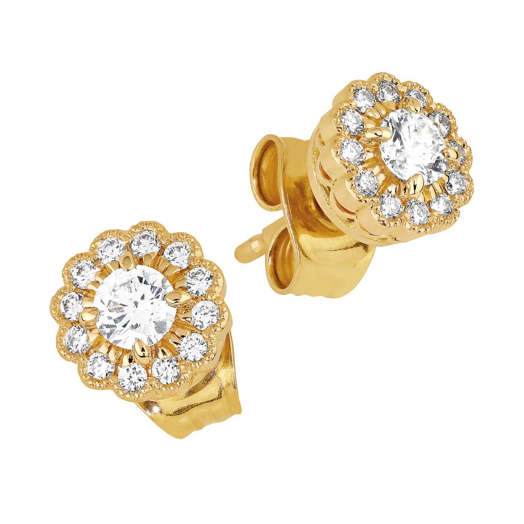 Kukkaniitty M-878k-korvakorujen kukkahalokoristeessa keskitimantin koko on 0,14 ct, kehyskivien istutuksessa on kaunis krysanttireunus.