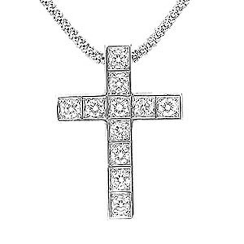 Upean näyttävä ristiriipus 11 säkenöivällä timantilla. Ristin pituus 21 mm ja valmistusmateriaali laadukas 18 karaatin palladiumvalkokulta.