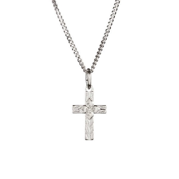 Tämä siro hopeinen ristiriipus on kuvioitu seppelemäisillä kuvioilla ja sen keskellä säihkyy aito timantti! Kukkakuvion keskellä säkenöivä timantti on painoltaan 0,01 ct. Pieni risti on valmistettu laadukkaasta 925 sterling-hopeasta. Ristin mitat ovat 10 x 16 mm, joten risti sopii erinomaisesti pientä ja siroa riipusta haluavalle. Ristiriipuksessa on säädettävä 42/45 cm pitkä ketju. Tämä sievä risti sopii erinomaisesti rippiristiksi nuorelle.