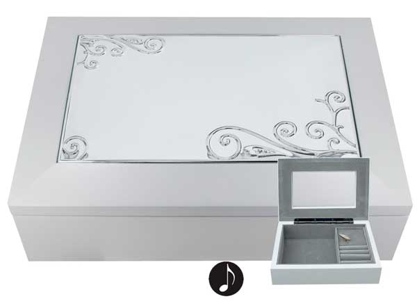 Kaunis valkoinen korurasia soittorasialla! Sisus pehmeää harmaata kangasta. Korulippaasta löydät lokerot niin kaulakoruille, sormuksille kuin korvakoruille. Kaiverrusmahdollisuus.