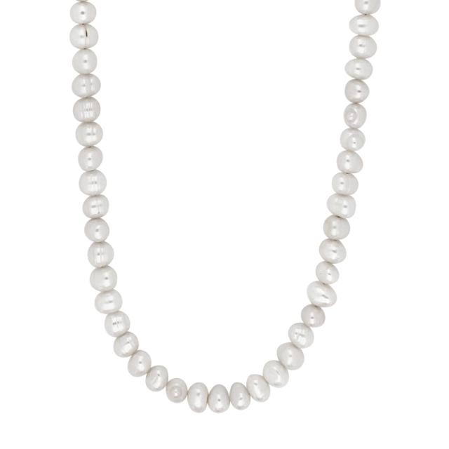 Naisten ja miesten helmikaulakoru valkoisilla aidoilla makeanveden viljellyillä helmillä. Yhden helmen koko on noin 5 mm. Ketjun pituus on 55 cm. Materiaali kirurginteräs.