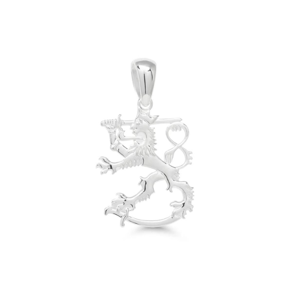 Hopeinen Suomileijona-riipus. Klassinen Suomileijona-hopeariipus, jonka leveys on 16,5 mm ja korkeus ilman riipuslenkkiä 20 mm.Riipus on ostettavissa ilman ketjua tai 45, 50 cm, 55 cm tai 60 cm pituisella hopeisella 2,45 mm leveällä panssariketjulla. Kaulakorun materiaali on laadukas 925 sterling-hopea.