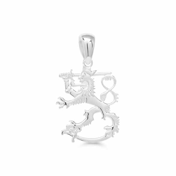Hopeinen Suomileijona-riipus. Klassinen Suomileijona-hopeariipus, jonka leveys on 19,5 mm ja korkeus ilman riipuslenkkiä 25 mm.