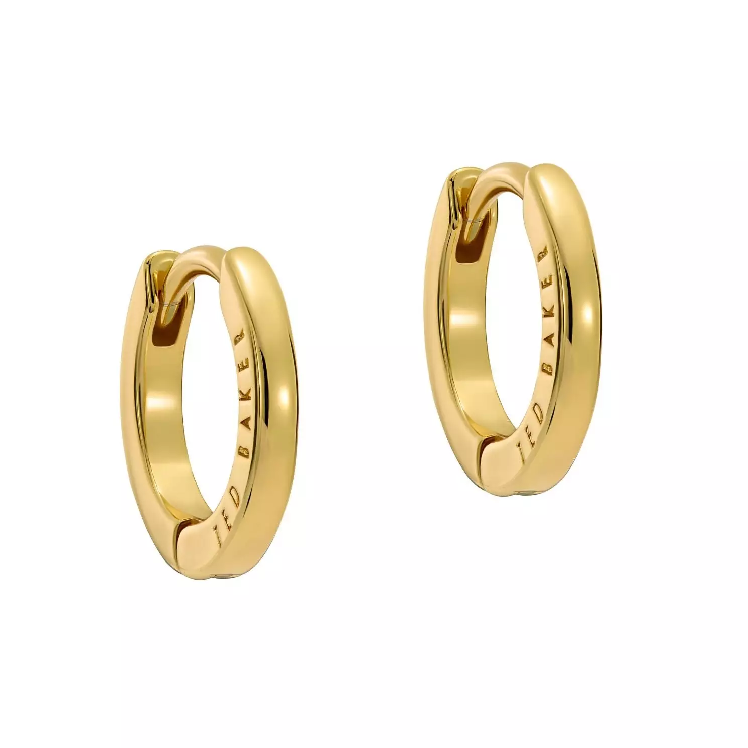 Naisten Ted Baker korvakorut kullan sävyssä. Klassiset korvarenkaat Ted Baker -logokaiverruksella ja kätevällä saranakiinnityksellä.