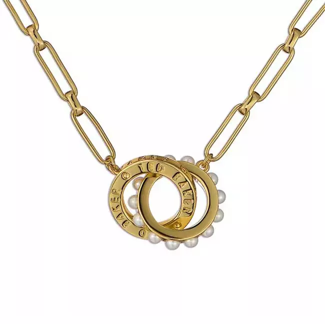 Naisten Ted Baker kaulakoru kullan sävyssä. Näyttävä kaulakoru kahdella lomittaisella riipuksella ja helmikoristeilla.