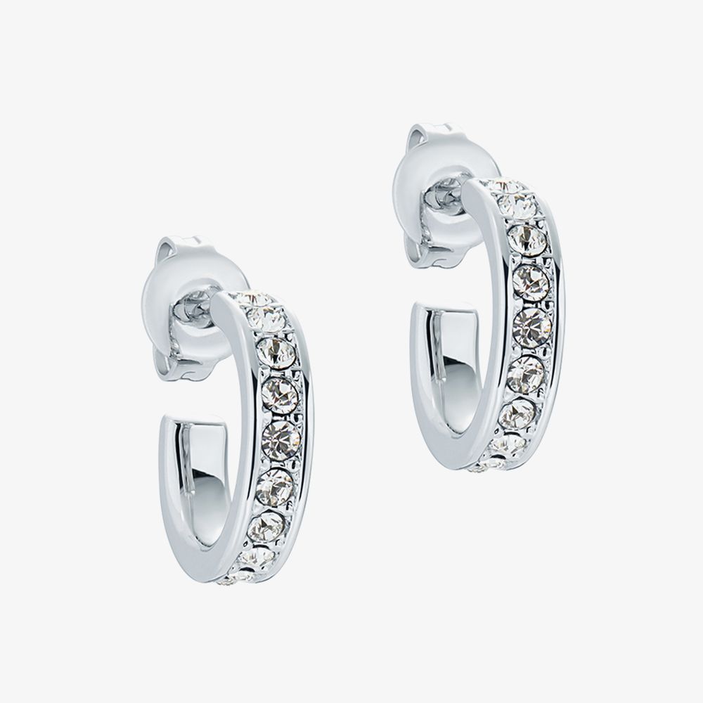 Naisten Ted Baker hopean sävyiset rengaskorvakorut kirkkailla kivillä. Säkenöivät korvarenkaat tukevalla tappikiinnityksellä. Korvakorujen koko on 11 mm. Ihanan sirot hoop-korvakorut elegantilla muotokielellä!