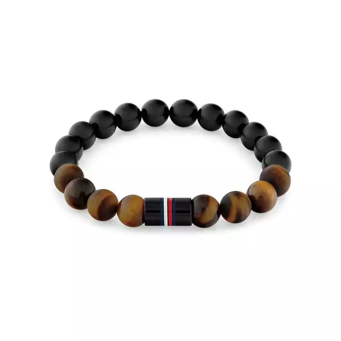 Miesten Tommy Hilfiger rannekoru, joka koostuu tyylikkäistä mustista ja monivärisistä helmistä sekä teräksisestä koruosasta. Rannekorun pituus on 18,5 cm.