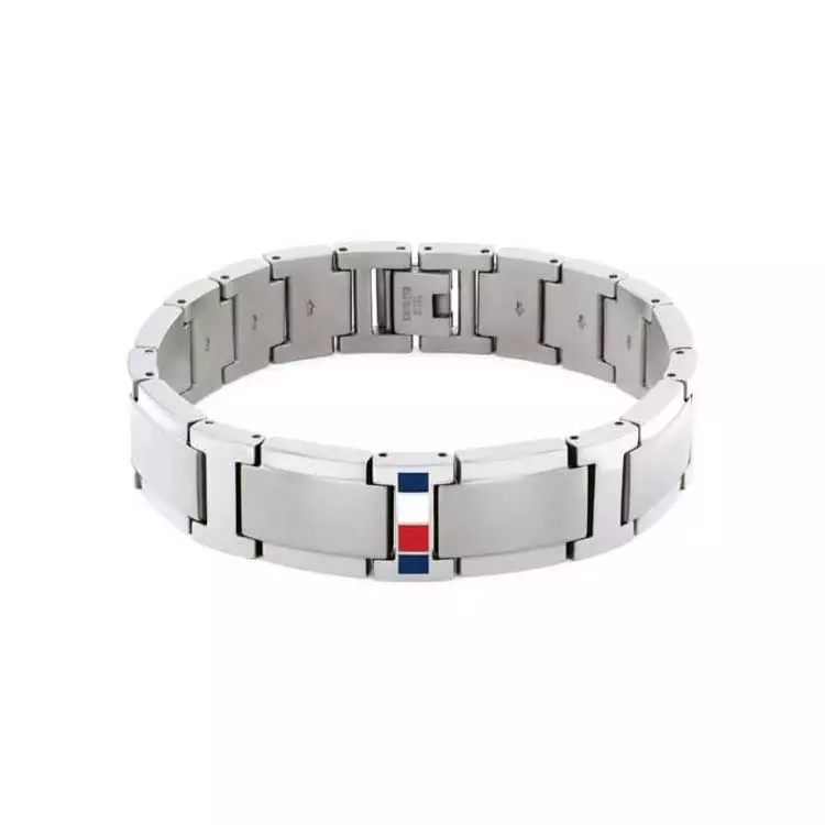 Miesten leveä hopean värinen teräksinen rannekoru. Tämä miesten teräsrannekoru on valmistettu kestävästä ruostumattomasta teräksestä. Rannekorun keskeltä sekä sen lukosta löytyy Tommy Hilfigerin logo. Rannekorun pituus on noin 21 cm ja sen leveys on noin 15 mm.