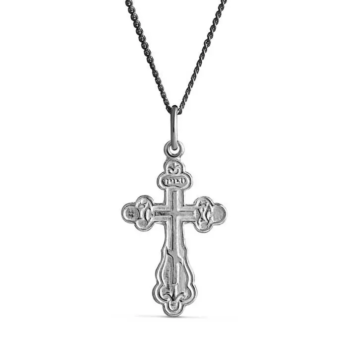 Koristeellinen tummennettu ortodoksinen ristiriipus kolmella poikkipuulla. Hopearistin korkeus on 21 mm ja leveys on 13 mm. Ketju on kätevästi säädettävissä pituuksiin 45/50 cm.