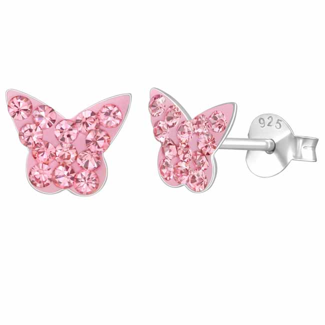 Lasten hopeiset perhonen-korvakorut. Kauniit hopeiset perhoskorvakorut säkenöivillä vaaleanpunaisilla korukivillä. Korvakoruissa on luotettava tappikiinnitys. Korvakorujen koko on 8 x 7 mm. Sirot ja kevyet nappikorvakorut, joita lapsi voi käyttää arjessa! Korvakorujen valmistusmateriaali on laadukas nikkelitön 925 sterling hopea.