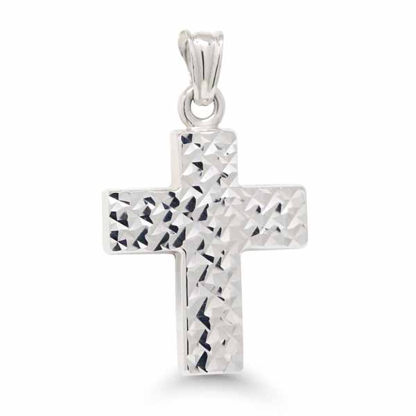 Valkokultainen ristiriipus kuvioidulla timanttileikatulla pinnalla sekä sileällä pinnalla. Ristiä voi käyttää kumpi tahansa puoli esillä! Ristin leveys on 13,5 mm ja korkeus 16 mm.