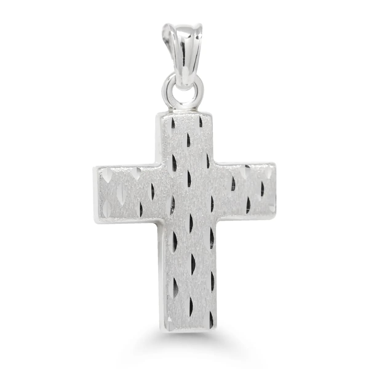 Valkokultaristi, jonka etupuolella on harjattu ja timanttileikattu pinta ja takapuolella kiillotettu sileä pinta. Ristiä voidaan käyttää kumminkin päin. Materiaali 14K valkokulta.