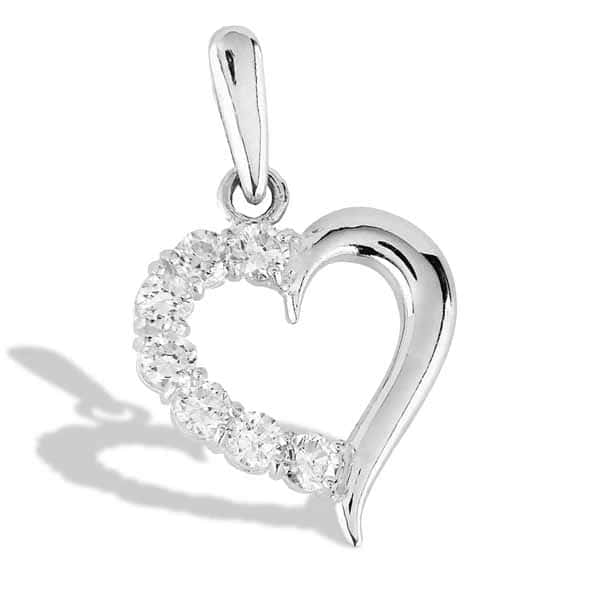 Kaunis valkokultainen sydänriipus kirkkailla zirkonia-korukivillä. Koruosan koko on noin 12 mm, riipuslenkin kanssa riipuksen korkeus on 19 mm. Valmistusmateriaali on laadukas 14 karaatin valkokulta.
