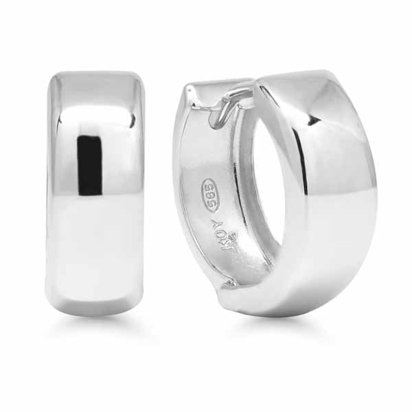 Valkokultaiset korvarenkaat sileällä pinnalla. Korvarenkaan leveys on 4,6 mm ja ulkohalkaisija 13 mm. Rengaskorvakoruissa on kätevä saranakiinnitys. Materiaali 14K valkokulta.