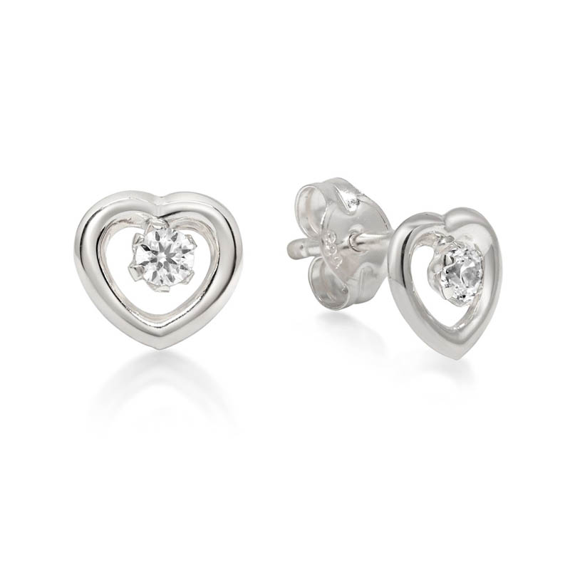 Kultakorvakorut 14k valkokultaa, joissa näyttävät zirkoneilla koristeltu sydän.