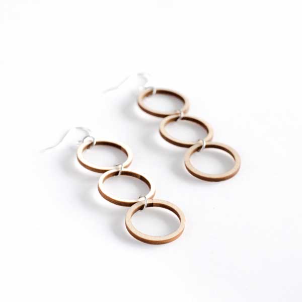 Koivuvanerista valmistetut puukorvakorut. Koruissa on koukkukiinnitys ja koukun materiaali on hopea. Koukuissa on mukana silikonitaustat joiden avulla korut pysyvät paremmin paikoillaan. Korvakorujen koruaiheena on täysikuu ja sen ääriviivat. Korussa on allekkain kolme keskeltä avointa rengasta, yhden renkaan halkaisija on 2,3 cm, koko korun korkeus on 6,5 cm. Nämä korut on saatavilla kahdessa eri värissä; puu tai musta.