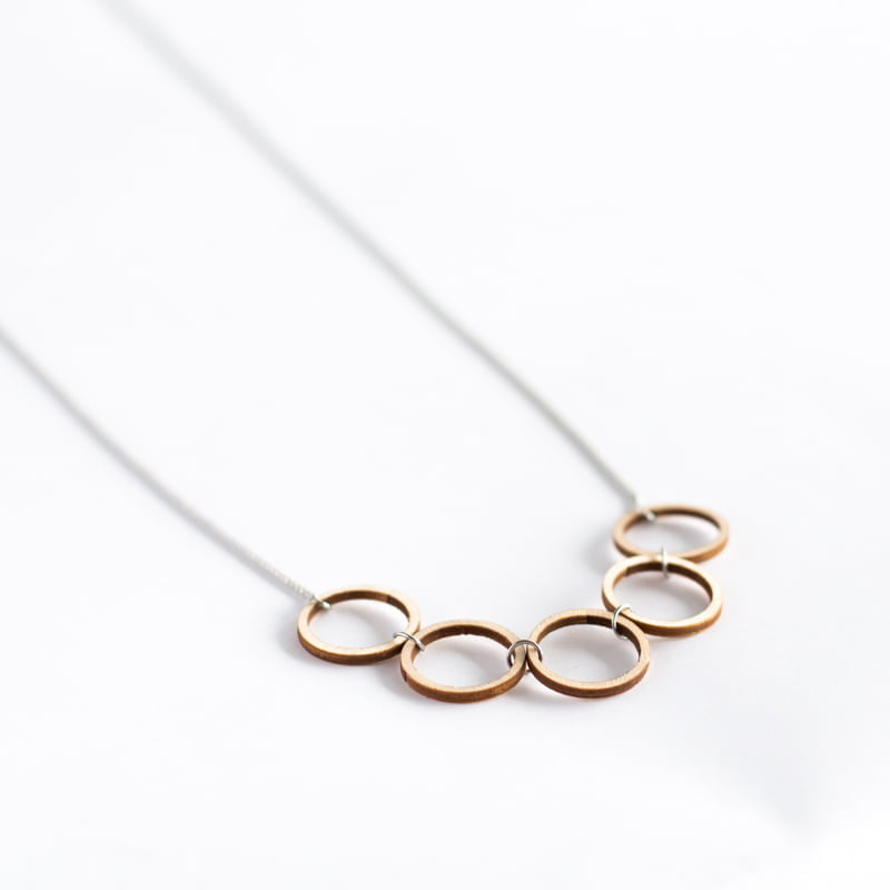 Koivuvanerista valmistettu puinen riipus. Riipuksessa on vierekkäin viisi keskeltä avointa rengasta, yhden renkaan halkaisija on 2,3 cm, koko korun leveys on noin 11 cm. Riipuksen ketju on valmistettu nikkelittömästä metallista ja sen pituus on 72 cm. Riipus on saatavilla kahdessa eri värissä; puu tai musta.