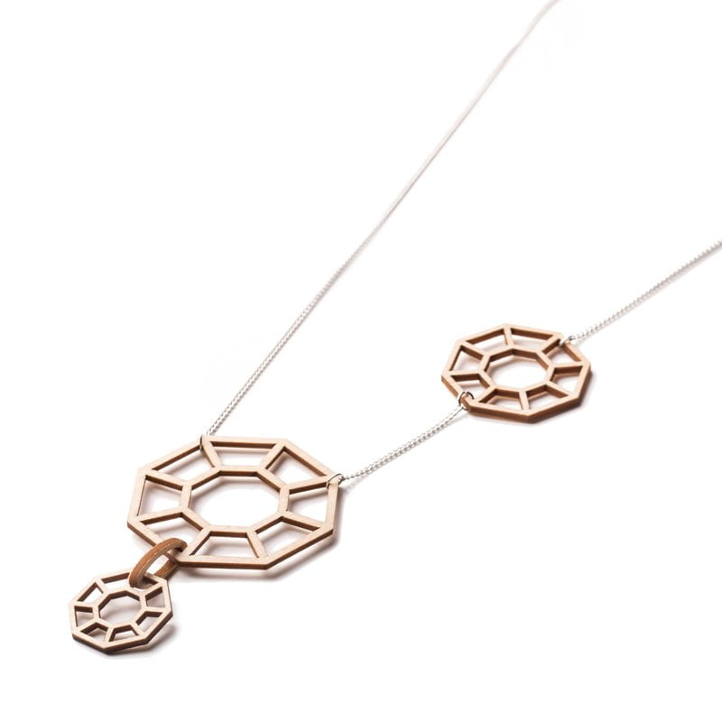 Koivuvanerista valmistettu puinen riipus. Riipuksessa on kolme eri kokoista kahdeksankulmiota, joista yksi on kiinnittynyt muita ylemmäs ketjuun ja kaksi roikkuvat korun alaosassa toisistaan kiinni. Riipuksessa on nikkelittömästä metallista valmisettu ketju, jonka pituus on 71 cm, joten on saatavilla neljässä eri värissä; puu, musta, sininen ja punainen. Koru painaa vain 7 grammaa, joka tekee siitä ihanan kevyen kantaa.
