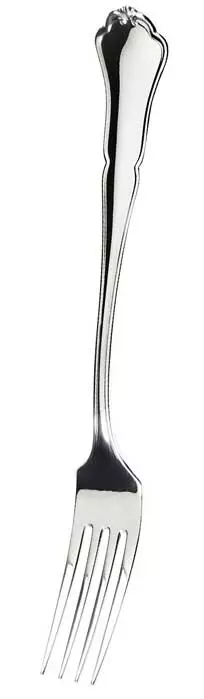 Kotimainen Kultakeskuksen Chippendale hopeinen ruokahaarukka. Klassinen Chippendale haarukka on 18,6 cm pitkä. Chippendale-ruokailuvälinesarjasta on vuosien varrella tullut ylivoimaisesti suosituin ja laajin hopeinen ruokailuvälinesarja.