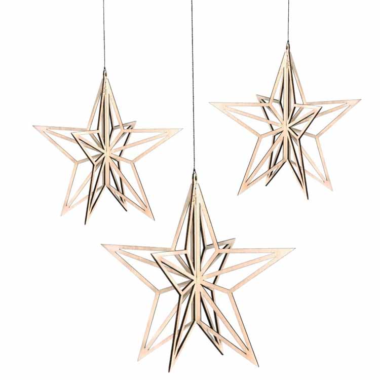 Kaunis joulukoristesetti, kolme koivuvanerista valmistettua puunväristä tähtikoristetta. Setti koostuu yhdestä isommasta ja kahdesta pienemmästä puutähdestä, jotka luovat yhdessä harmonisen kokonaisuuden. Tähden muotoiset joulukoristeet ovat elegantit ja kevyet, ja sopivatkin erinomaisesti esimerkiksi joulukuusenkoristeiksi. Tähden malli on kolmiulotteinen, eli se näyttää yhtä kauniilta joka suunnasta katsottuna. Kolmen tähden setti pakataan kauniiseen pakettiin, joka sopii sellaisenaan myös lahjaksi. Puukoristeissa käytetty vaneri on 100% kotimaisesta, sertifioidusta koivumetsästä.