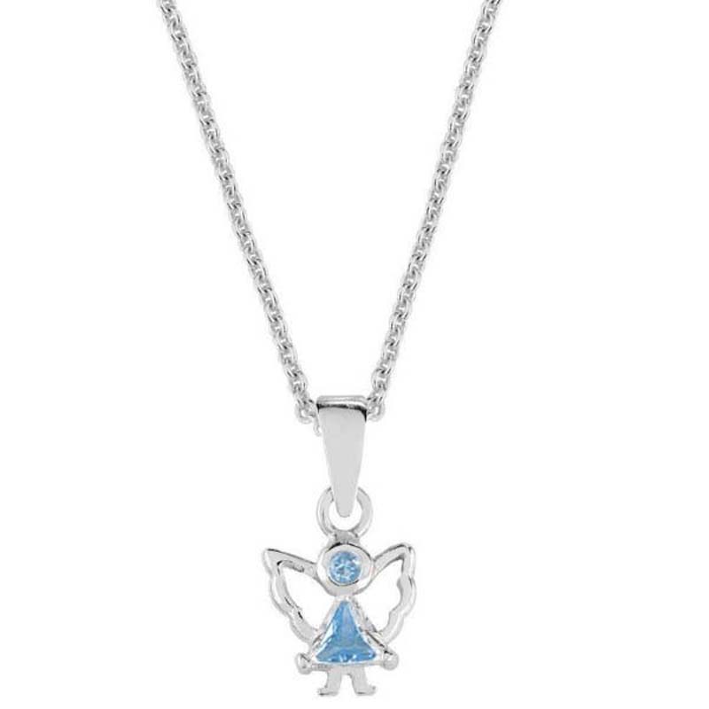 Suloinen suojelusenkeli säihkyvän sinisillä zirkoneilla. Kaunis enkeli -riipus on ihana lahja pienokaiselle.