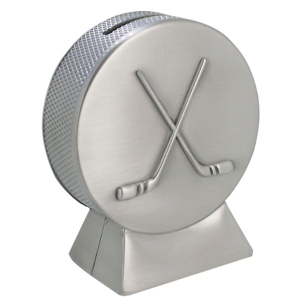 Tämä säästöpankki on täydellinen lahja jääkiekkofanille! Hieno jääkiekon muotoinen säästöpankki, jonka kyljessä on kaksi mailaa. Pankkiin on mahdollista tehdä kaiverrus.