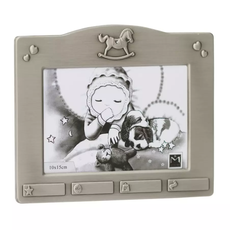 Suloinen kastekehys, jota koristavat keinuhevonen sekä sydämet. Valokuvakehyksen koko on 19 x 14,5 cm ja sen kuvakoko on 15 x 10 cm. Kehykseen on valittavissa kaiverruspalvelu.