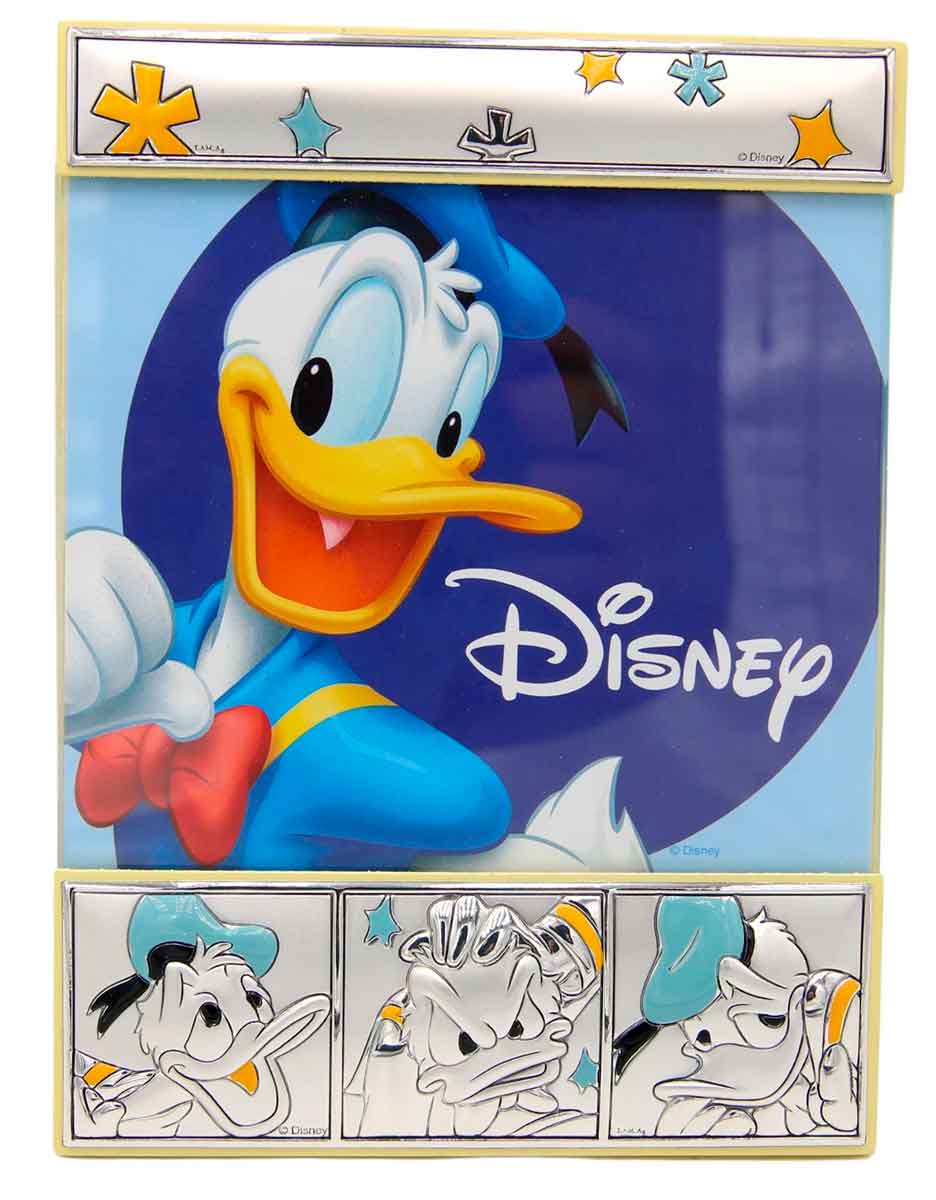 Disney-aiheinen valokuvakehys, jossa esiintyy Aku Ankka. Kehyksessä on kolme kuvaa Aku Ankasta. Hopeoitu pinta ja vaaleansinistä sekä keltaista esiintyy kehyksessä.