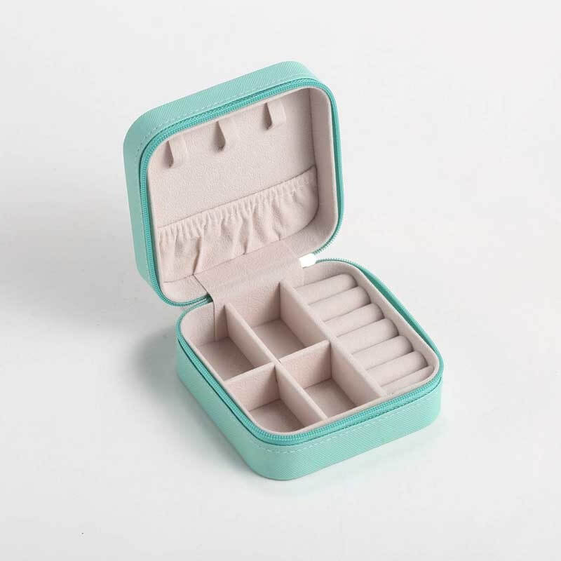 Kaunis ja kompakti turkoosin sävyinen keinonahkainen korurasia. Rasian sisus on pehmeää beigen sävyistä kangasta, jonka hellässä huomassa rakkaat korusi pysyvät suojassa naarmuilta. Rasian turkoosi pinta on kestävää ja likaa hylkivää keinonahkaa. Korulippaasta löydät omat paikat niin kaulakoruille, sormuksille kuin korvakoruillekin. Korulaatikon sisältä löytyy lokerikko, jolla voit jakaa korurasiaa tarpeen mukaan neljään tai kahteen osaan ja jonka voit tarvittaessa myös kokonaan irrottaa, jos tarvitset isomman yhtenäisen tilan esimerkiksi rannekorulle. Neliön muotoisen korurasian koko on 10 x 10 x 5 cm ja se suljetaan kätevästi vetoketjulla. Kätevän kompaktin kokonsa puolesta voit ottaa korurasian myös mukaan matkalle matkakorurasiaksi. Korurasia on myös ihana lahjaidea.