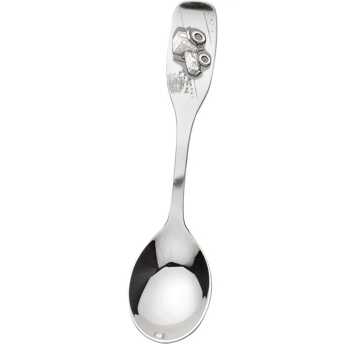 Hopeasta valmistettu komea kummilusikka. Lusikkaa koristaa traktori. Lusikan takana on kaiverruspaikat ajalle, painolle sekä pituudelle.