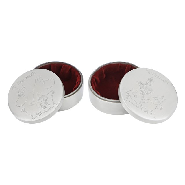 Ihanat ensirasiat joihin säilö pienokaisen ensikihara ja ensihammas! Rasioita koristaa rakastetut Muumi-hahmot. Rasioiden sisällä on tummanpunainen samettikangas.