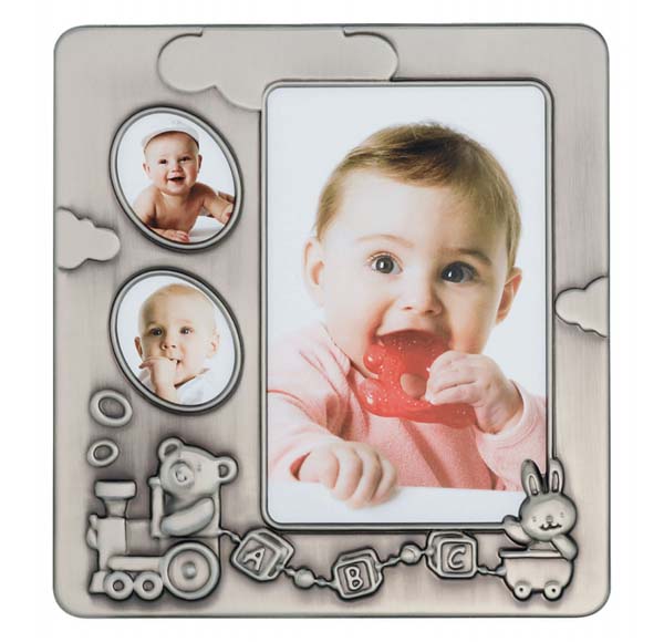 Valokuvakehys, jossa on kolme paikkaa valokuville. Isoimpaan paikkaan mahtuu 10 x 15 cm kokoinen valokuva ja pienempiin paikkoihin 3 x 4 cm kokoiset valokuvat. Kehystä koristaa suloiset nalle ja pupu kaverukset, jotka ajavat junalla.