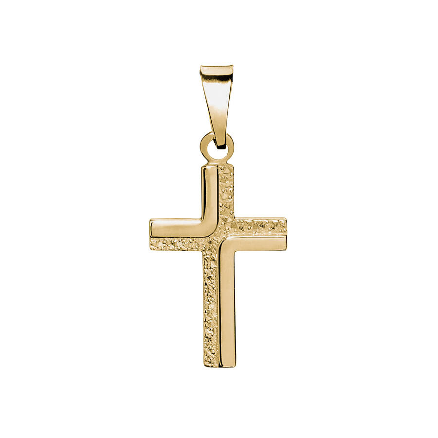 Keltakultainen ristiriipus. Klassisen pelkistetty risti, jossa on mielenkiintoinen pinta. Ristin mitat on 11 x 20 mm, riipus ei sisällä ketjua. Erinomainen rippiristi nuorelle.