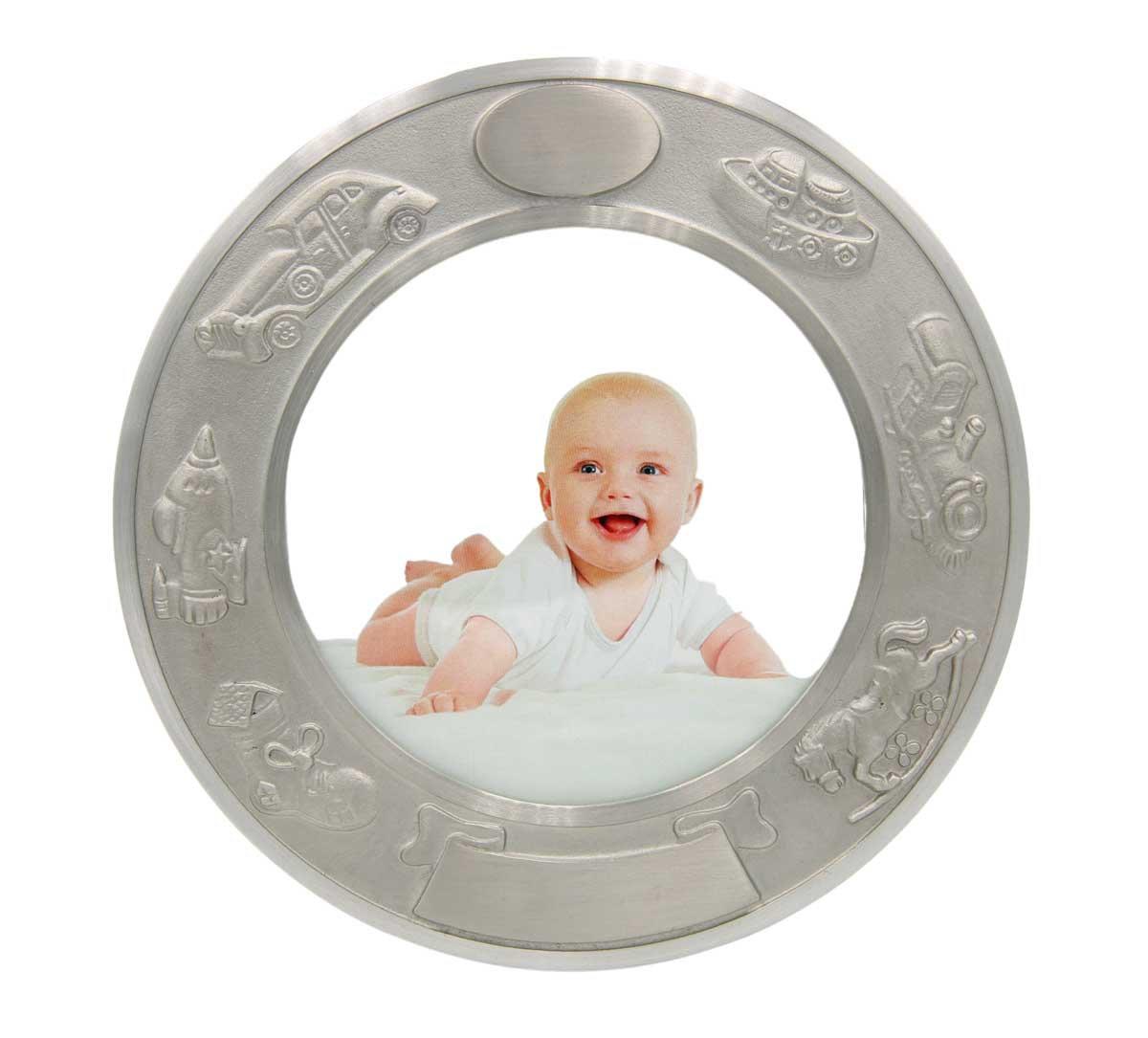 Tinattu kastekehys, halkaisija 16 cm. Kehyksen materiaali on tina.