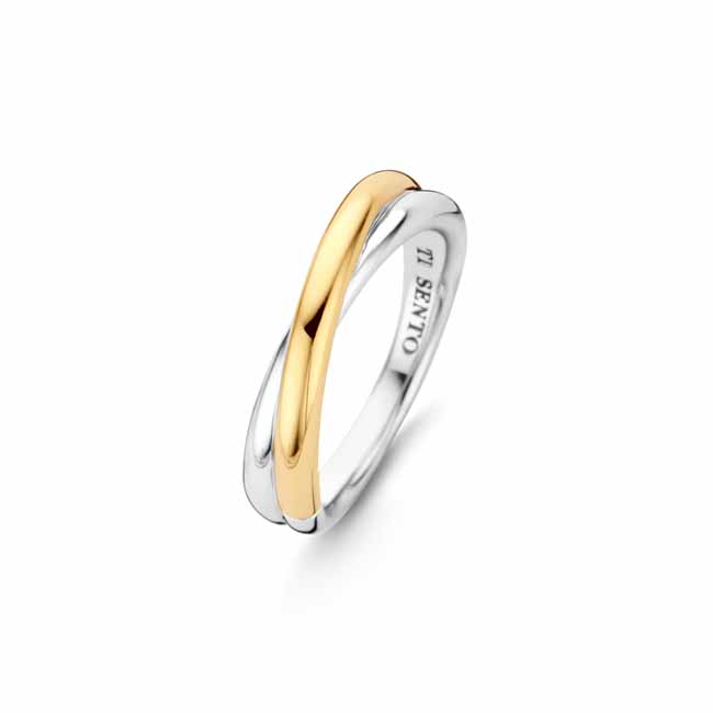 Naisten kaksivärinen hopeasormus. Tämä Ti Senton kullattu sormus ihastuttaa lomittain kulkevilla, toisiinsa kiinnitetyillä sormuksilla. Hopean ja kullan yhdistelmä on ajaton ja elegantti. Sormuksen runko on leveimmillään 4 mm ja takaa 2 mm leveä. Sormuksen materiaali on laadukas 925 sterling-hopea. Sormuksen koko on valittavissa vaihtoehdoista 16,6 mm, 17,2 mm tai 17,8 mm (tuotteen kokovaihtoehdoissa pyöristetyt luvut).