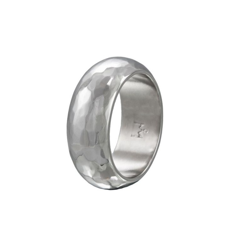 Ilkka Marttiini taottu puolipyöreä terässormus on ajaton valinta. Tyylikkään ja hieman massiivisen terässormuksen pinta on sepän takoma, jolloin jokainen sormus on uniikki tuote. Sormuksen rungon leveys on 8 mm leveä ja sen profiili puolipyöreä. Sormus on valmistettu teräksestä, jolloin se kestää niin aikaa kuin elämänkin kolhuja. Ilkka Marttiini terässormus on erinomainen lahjaidea henkilölle, joka arvostaa kestävyyttä sekä ajatonta muotoilua. Sormusten suunnittelu sekä valmistus on Suomessa ja jokainen Ilkka Marttiini sormus on käsin leimattu sepän toimesta. Sormuksen rungon leveyden vuoksi on suositeltavaa varmistaa oikea koko. Usein on suositeltavaa valita normaalia sormuskokoaan puoli numeroa suurempi koko, jotta voidaan taata sopiva istuvuus.