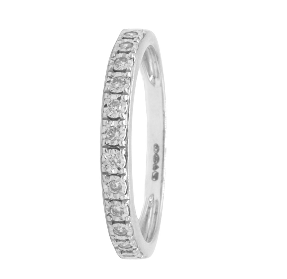 Valkokultainen rivitimanttisormus, johon on istutettu 12 kappaletta säihkyvää timanttia, jotka ovat yhteispainoltaan 0,16 ct.