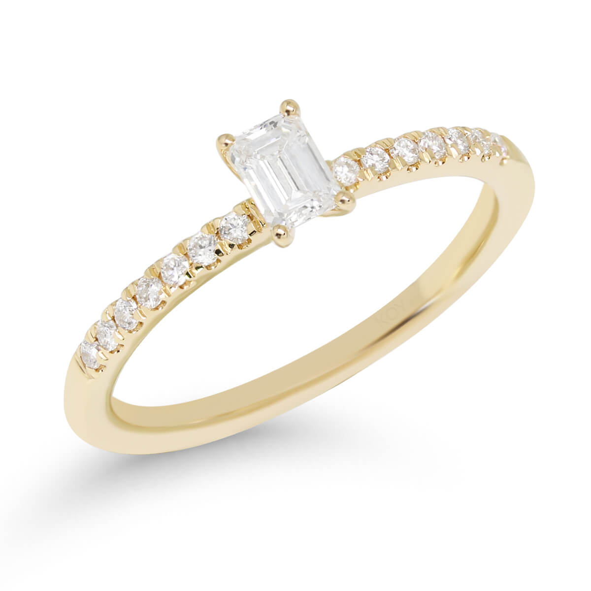 Keltakultainen sivukivisormus laboratoriotimanteilla. Ihanan siro Beat of Love Helen timanttisormus on valmistettu laadukkaasta 14 karaatin keltakullasta. Sormuksen runko on profiililtaan puolipyöreä ja rungon leveys on 1,6 mm, kyseessä on siis siro sormus. Sormuksen 4-kyntisessä istutuksessa säkenöi ihana 0,25 ct smaragdi-hiottu laboratoriotimantti, jonka mitat ovat noin 4,3 mm x 3 mm. Sormuksen siroon runkoon on istutettu yhteensä 14 briljanttihiontaista timanttia, seitsemän aina keskikiven molemmin puolin. Sivukivien yhteispaino on noin 0,10-0,11 ct. Klassisen tyylikäs Helen timanttisormus sopii erinomaisesti kihla- tai vihkisormukseksi ja se on helppo yhdistää esimerkiksi rivitimanttisormuksen tai sileän kihlasormuksen kanssa.