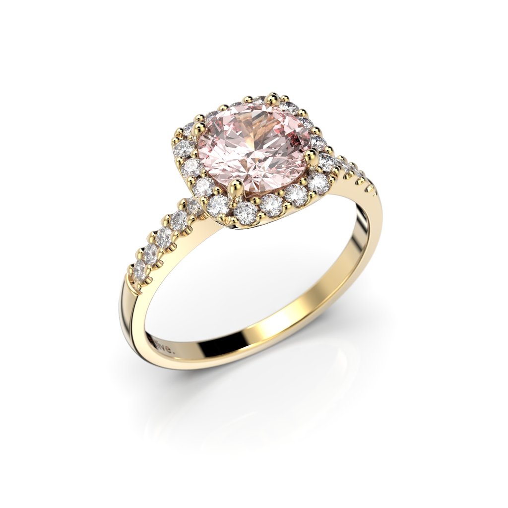 Upea Festive Jennifer morganiittisormus jonka keskellä loistaa kaunis vaaleanpunainen morganiitti ympärillään pienemmät timantit. Rungossa 10 pienempää timanttia.